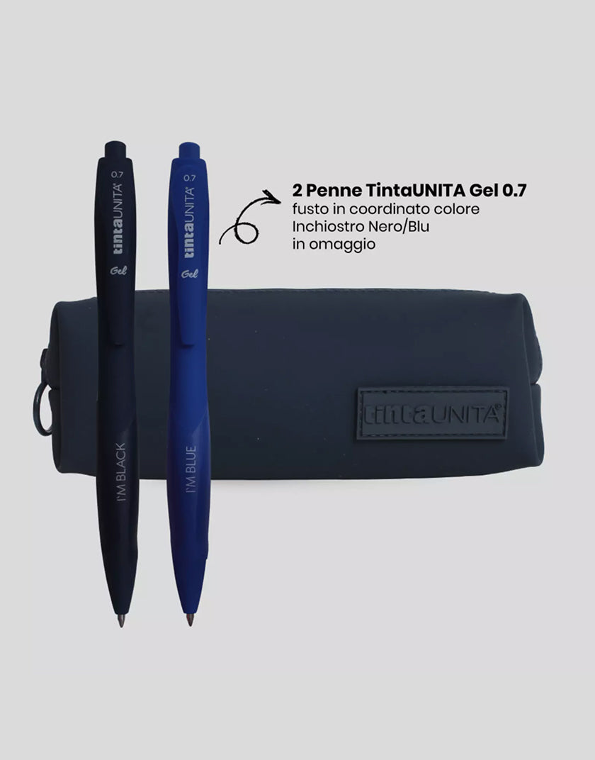- 2 penne gel Tinta Unita: Inchiostro nero e blu con punta da 0.7 mm, per una scrittura scorrevole e precisa.