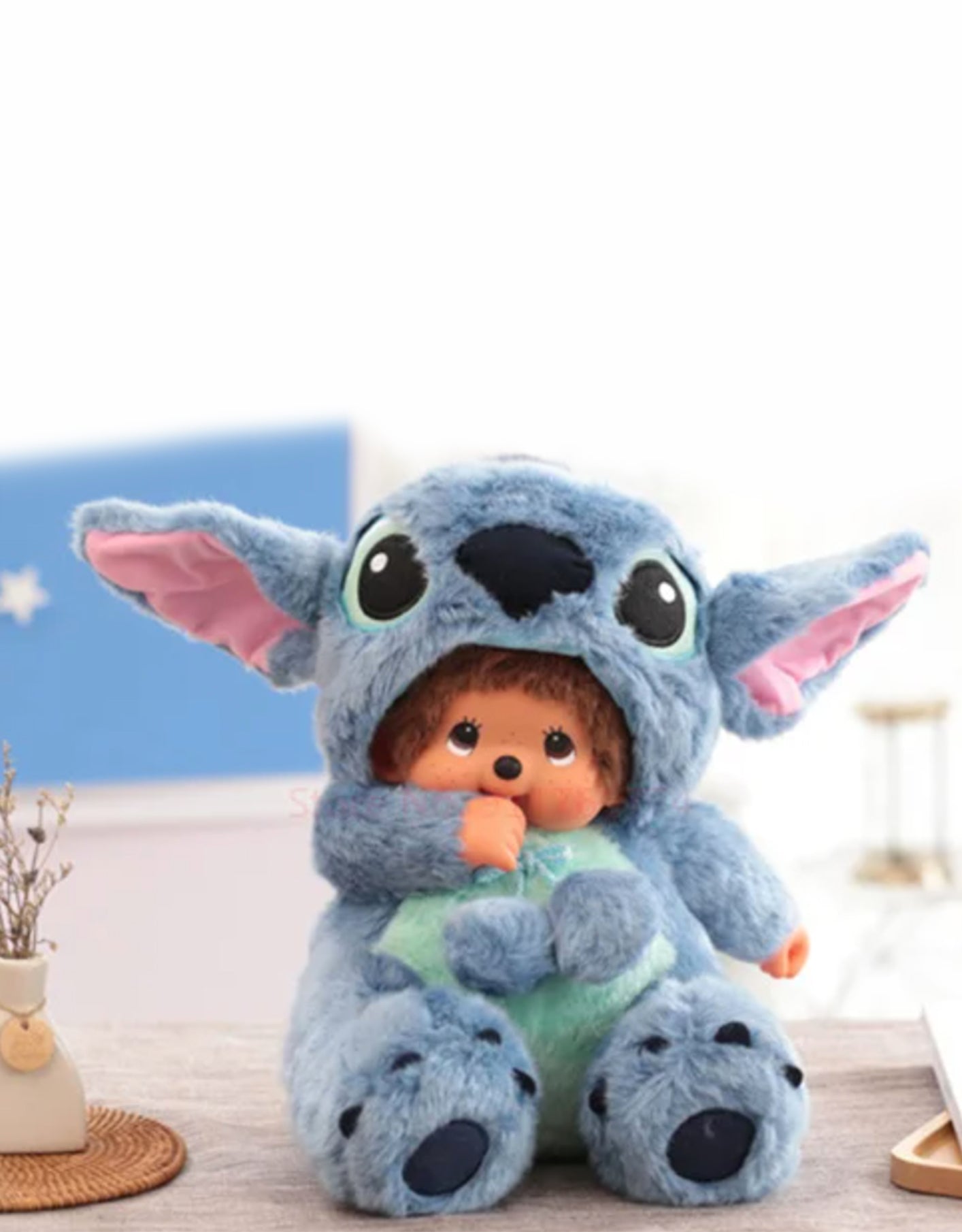 Questo adorabile personaggio è vestito con un costume da Stitch (il celebre alieno blu di Lilo & Stitch) completo di cappuccio abbassabile: puoi alzarlo per rivelare il simpatico viso di Monchhichi o abbassarlo per trasformarlo nel dolce alieno della Disney!